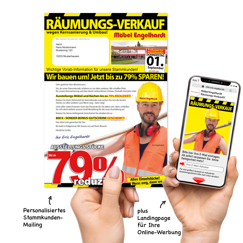 Ob Kollektionswechsel, Räumungsverkauf, Jubiläum oder Neu-Eröffnung - verlassen Sie sich auf erprobte Kampagnen zu jeder dieser Sonderverkaufs-Aktionen! Tausendfach bewährt und stetig weiterentwickelt mit dem richtigen Medien-Mix in Print und Online. Vom Stammkunden-Mailing bis zur intuitiven IZA-Landingpage ab 444 €.
